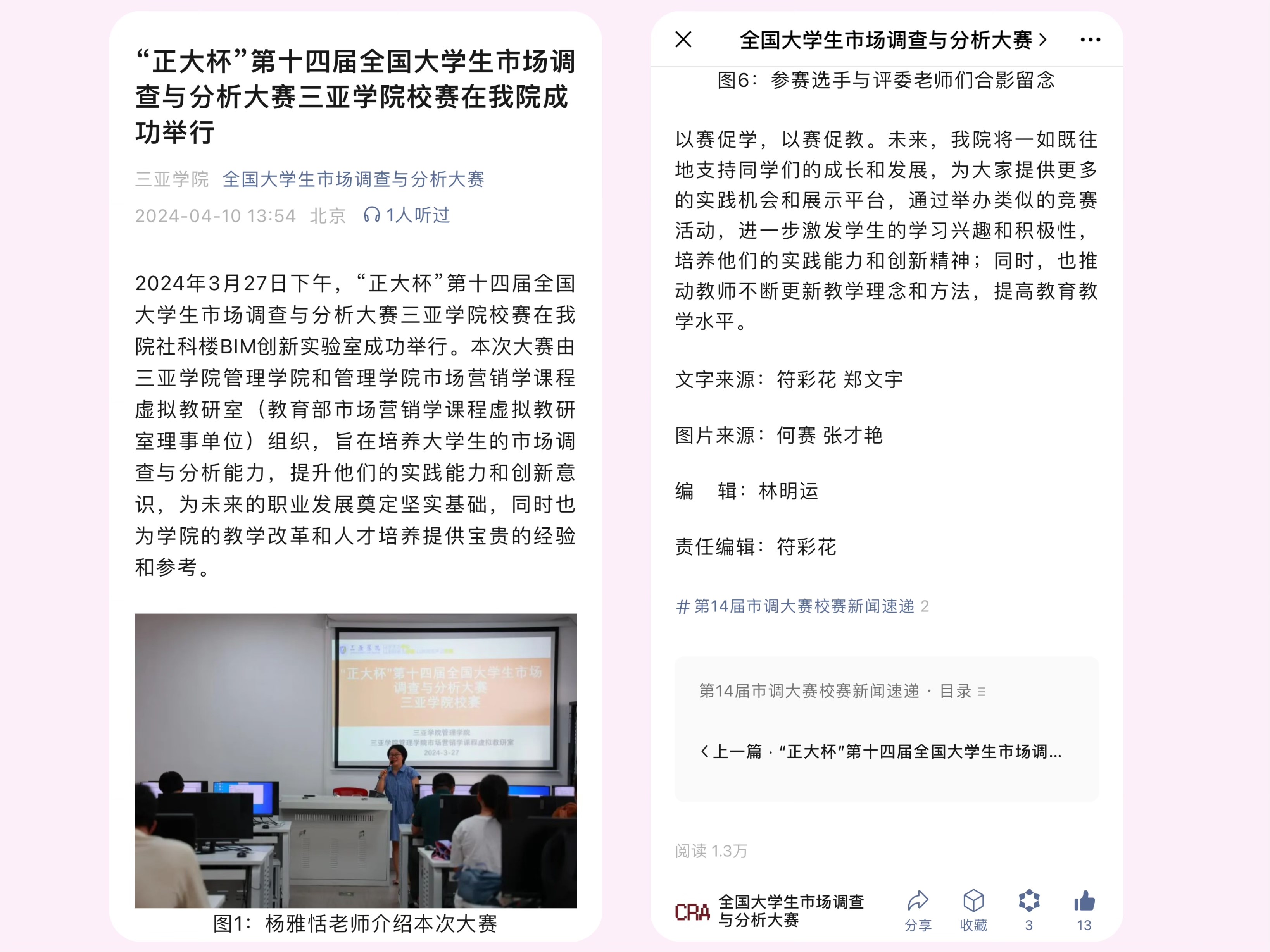 2024年4月10日,“全国老员工市场调查与分析大赛”公众号发布消息,报道了由太阳成集团tyc122ccvip和三亚学院太阳成集团tyc122ccvip市场营销学课程虚拟教研室(教育部市场营销学课程虚拟教研室理事单位)组织,于3月27日成功举办的“正大杯”第十四届全国老员工市场调查与分析大赛太阳成集团tyc122ccvip校赛。该消息一经发布,便引起了广泛关注,截止至4月11日,阅读量已达1.3万。